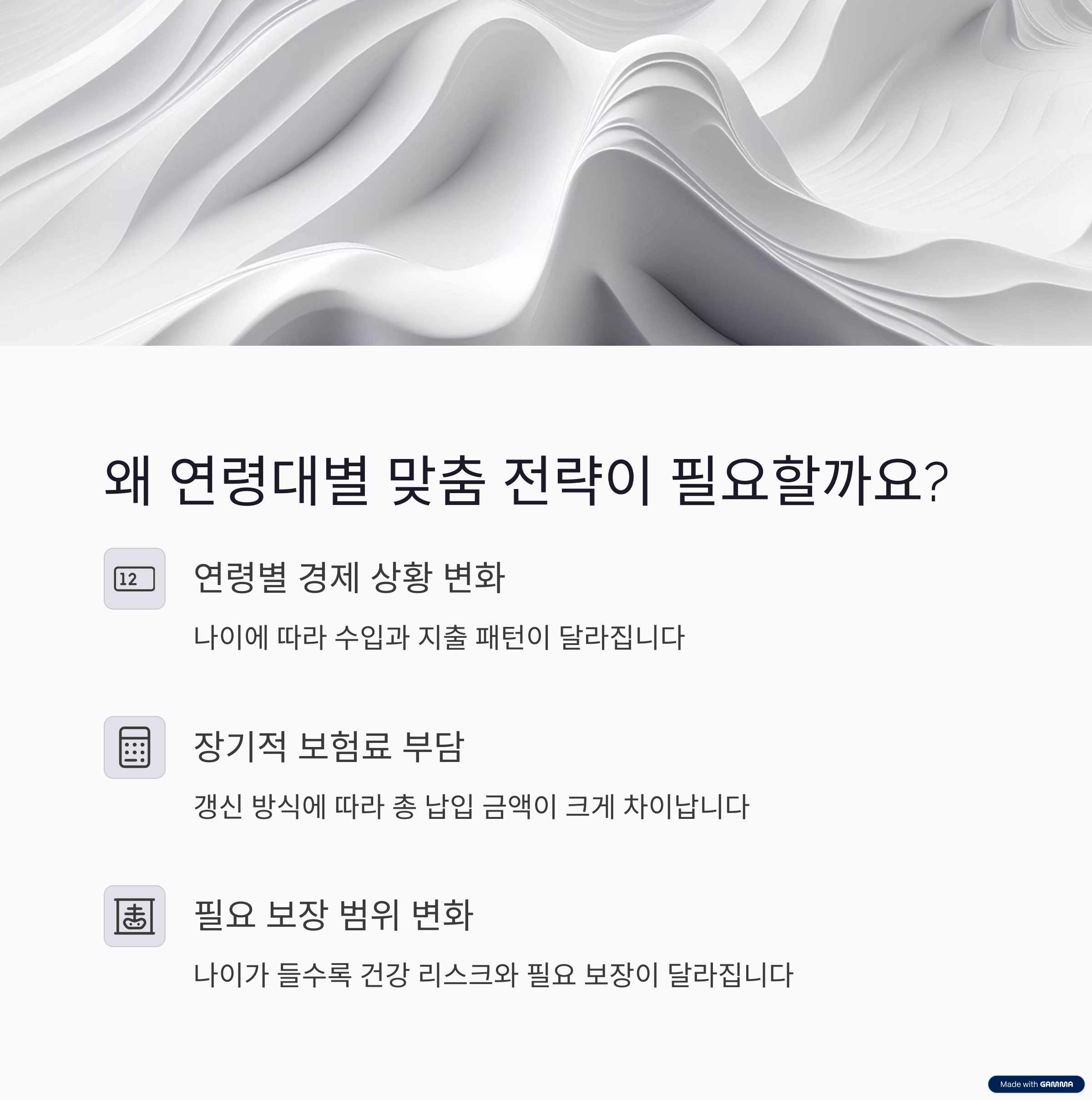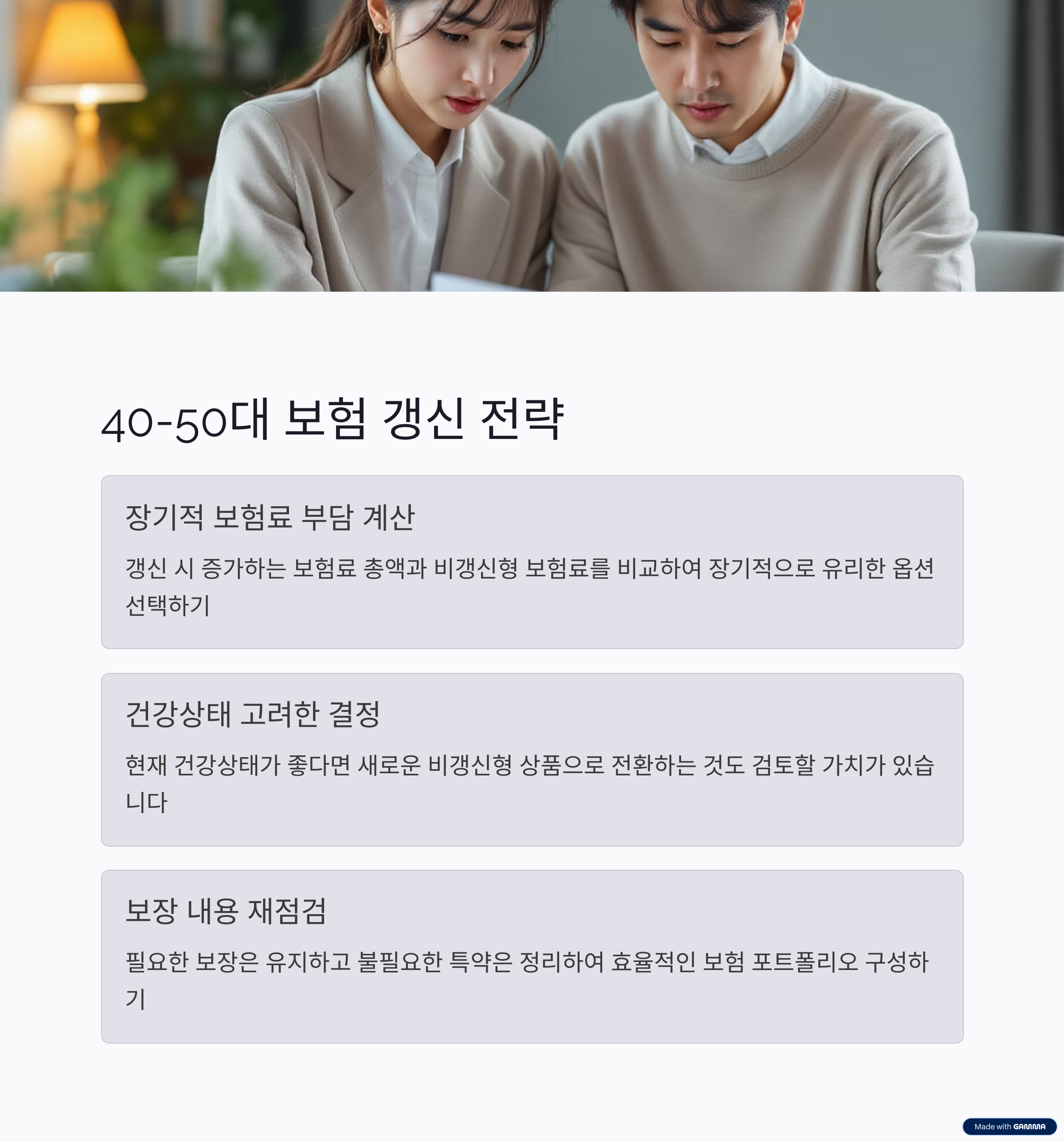 - 20-30대: 갱신형 활용 전략 - 경제력이 부족한 시기이므로 저렴한 갱신형으로 시작해서 소득 증가 후 비갱신형으로 전환